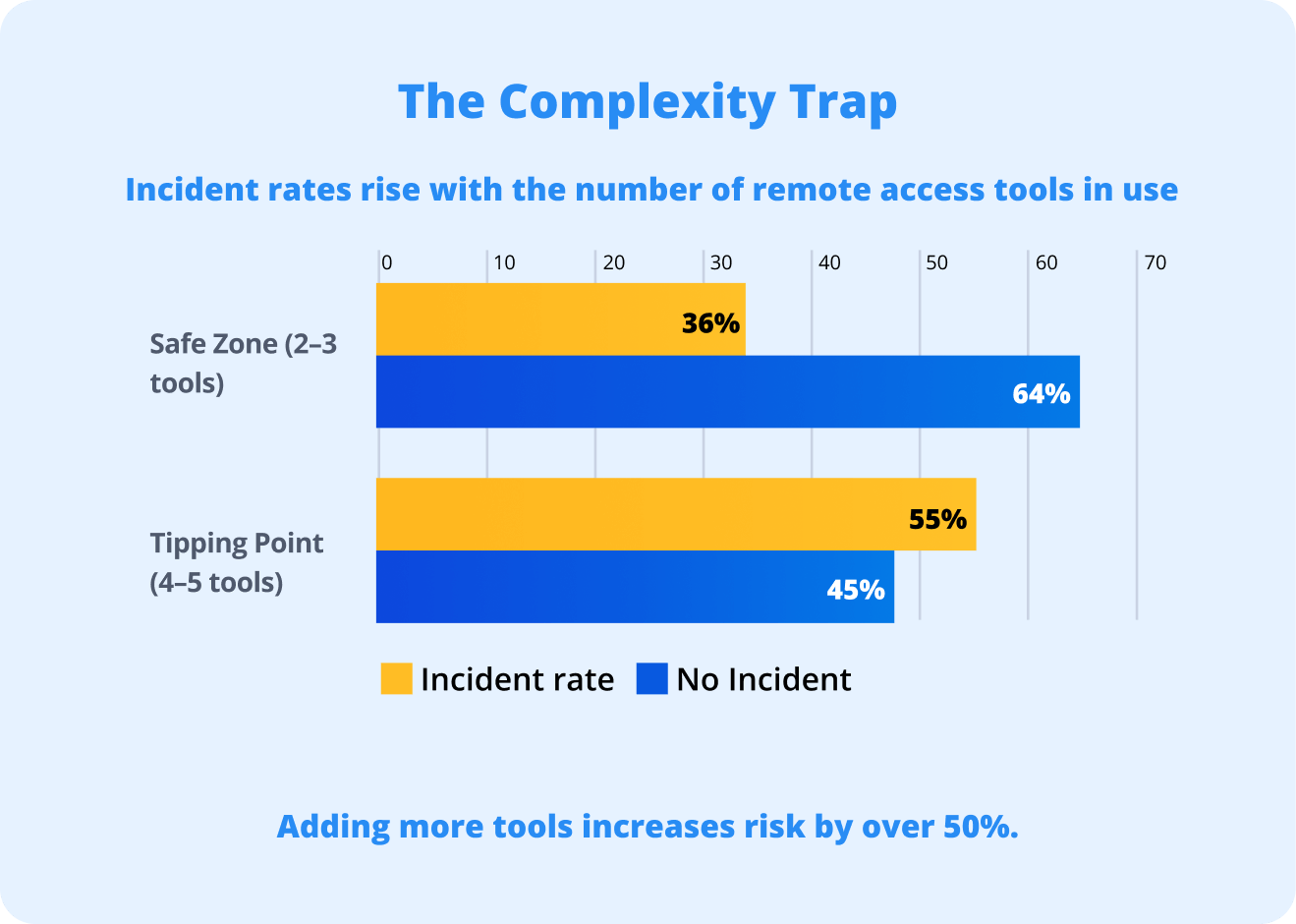 - The Safe Zone: Organizations using 2–3 remote access tools had the lowest incident rate (~36%)