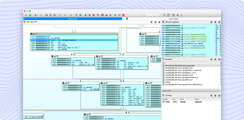 IDA yalnızca bir disassembler değil, aynı zamanda çok yönlü bir hata ayıklayıcıdır. Diğer programlardaki hataların tespitine ve düzeltilmesine yardımcı olmanın yanı sıra, birden fazla hata ayıklama hedefini destekler ve uzaktan uygulamaları işleyebilir.